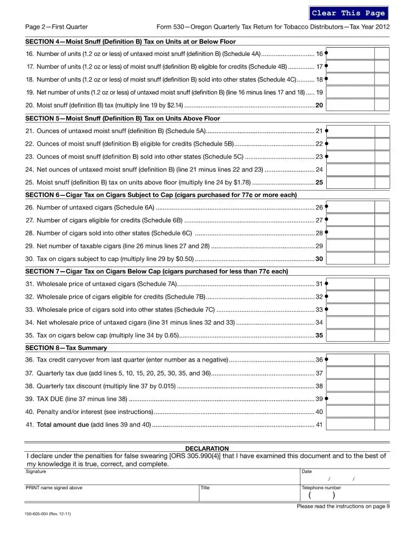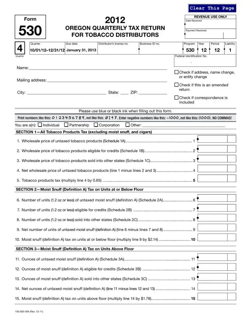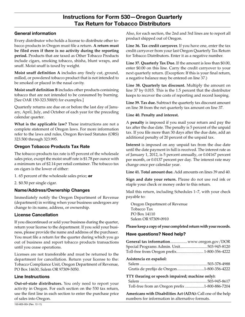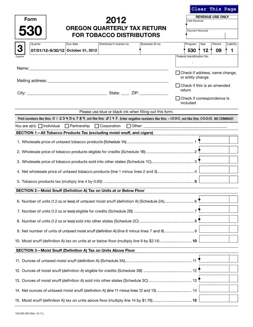 The 530 Oregon form is a crucial document for tobacco distributors operating in the state. This quarterly tax return helps businesses report and pay taxes on various tobacco products, including cigarettes, cigars, and moist snuff. Distributors must provide detailed information about their sales, including the wholesale price of untaxed products, products eligible for tax credits, and those sold to other states. The form is divided into sections that address different types of tobacco products, allowing for a clear breakdown of tax liabilities. For instance, there are specific sections for moist snuff, which is categorized based on weight and tax rates. Additionally, the form includes calculations for taxes due and potential discounts, ensuring that distributors can accurately determine their financial responsibilities. It's essential to fill out the form correctly and completely, as any discrepancies could lead to penalties or interest charges. By adhering to the guidelines outlined in the form, distributors can stay compliant with Oregon's tax regulations.