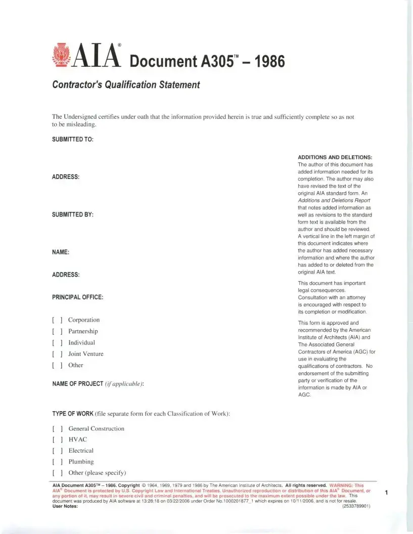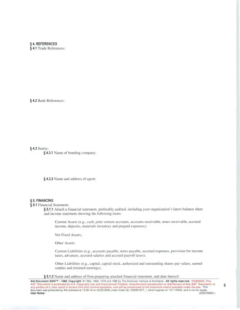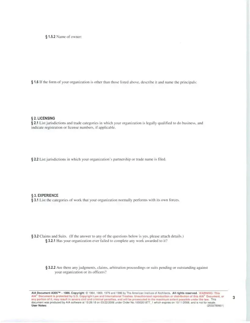 AlA Document A305™ - 1986. Copyright © 1964, 1969, 1979 and 1986 by The American Institute of Architects. All rights reserved. WARNING : This |