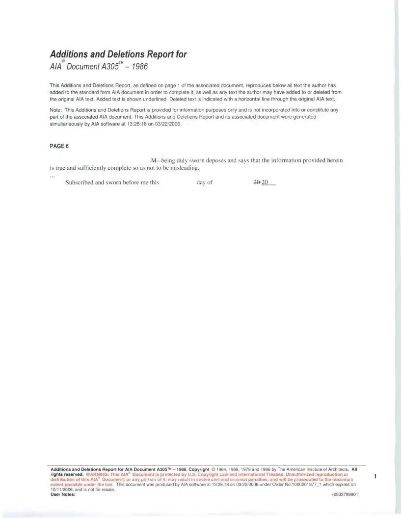 Note: This Additions and Deletions Report is provided for information purposes only and is not incorporated into or constitute any part of the associated AlA document. This Additions and Deletions Report and its associated document were generated simultaneously by AlA software at 13:28:18 on 03/22/2006.