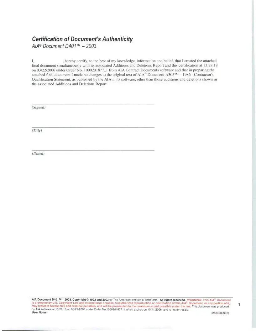 document was produced by AlA software at t 3:28:18 on 03/22/2006 under Order NO .1000201877_ 1 which expires on 10/ 11 /2006 , and is not for resale . |
