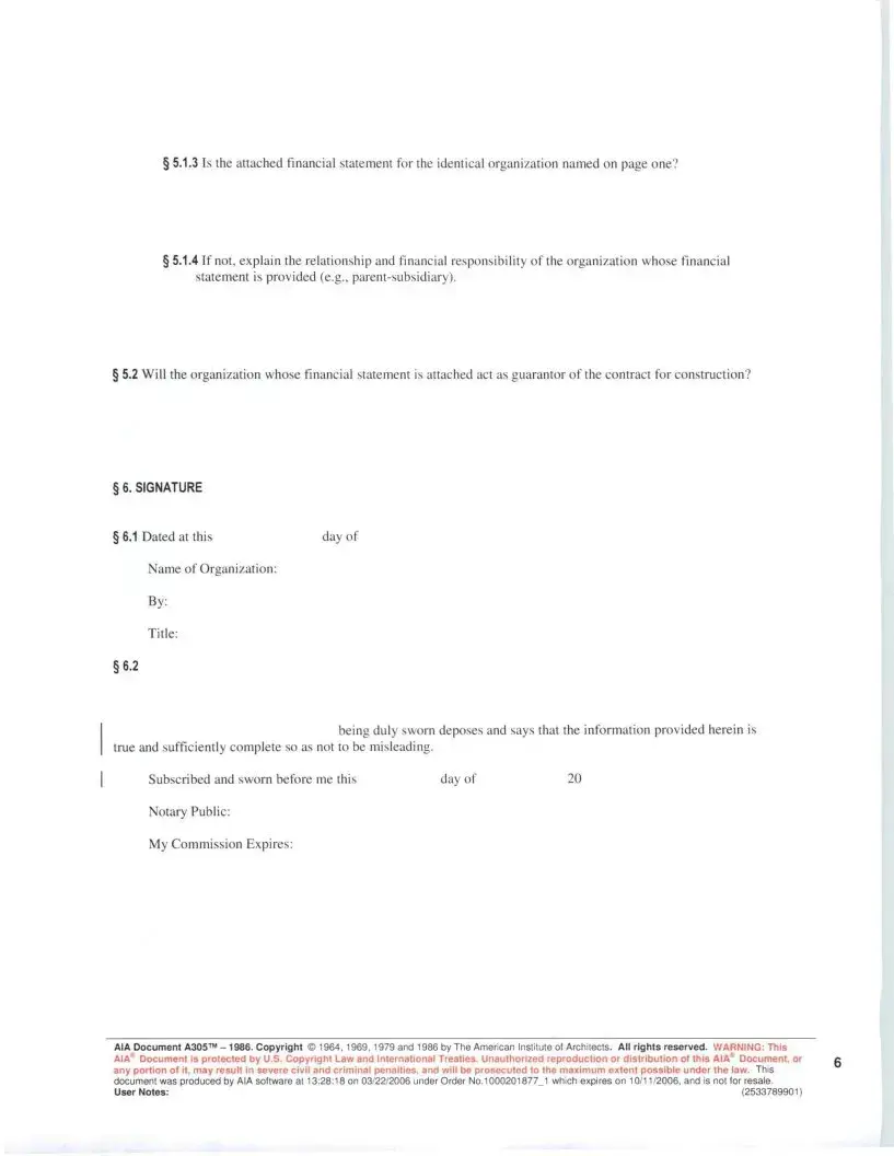 AlA Document A305™ - 1986. Copyright © 1964, 1969, 1979 and 1986 by The American Institute of Architecls. All rights reserved. WARNING: This |