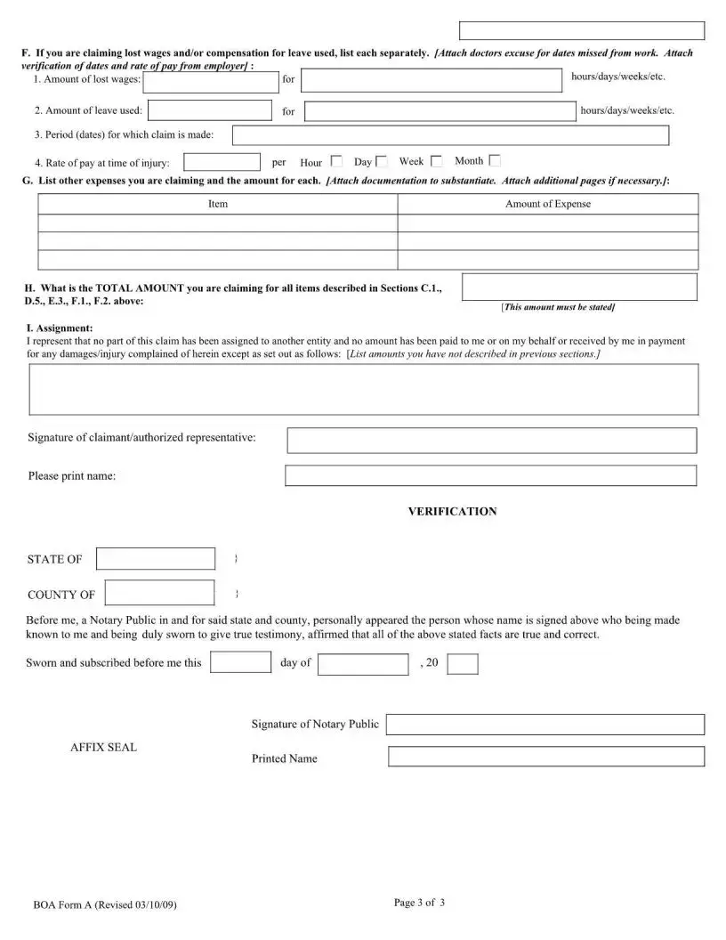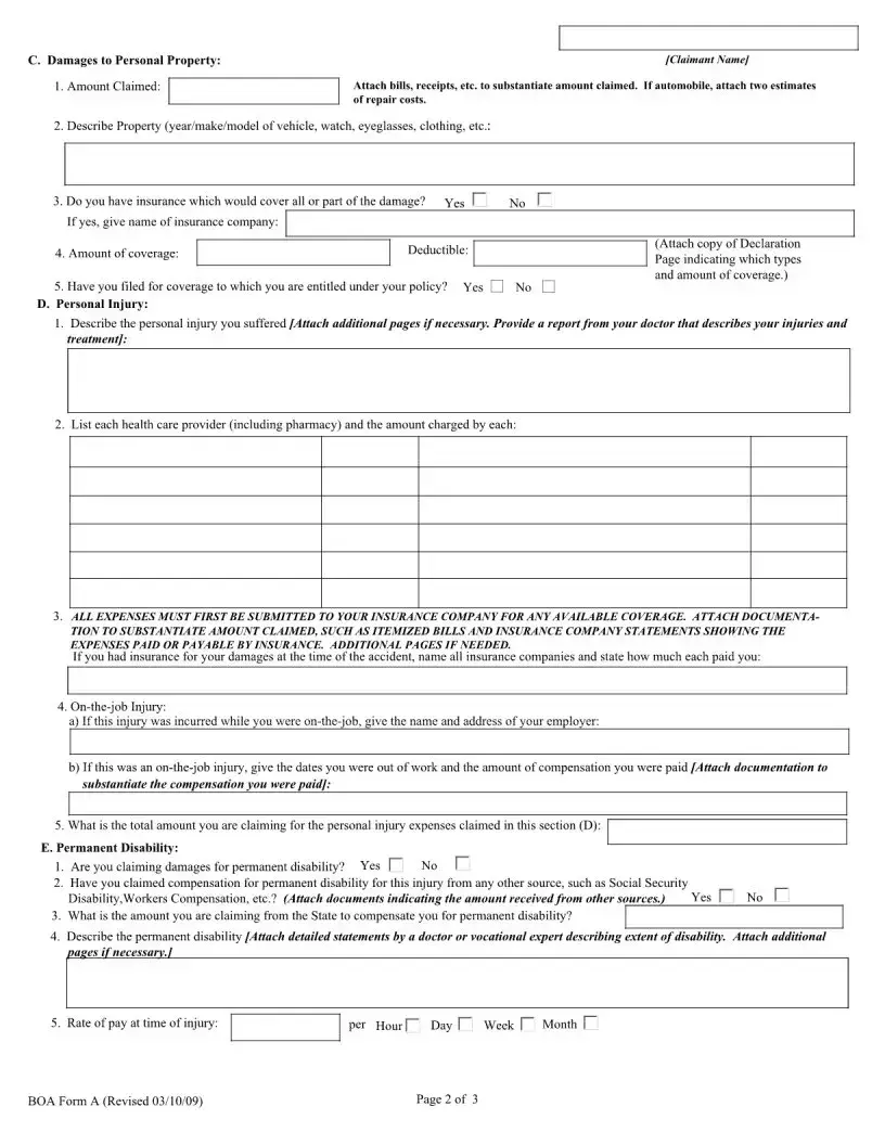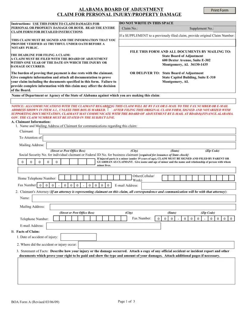 The Alabama Boa A form is an essential document for individuals seeking compensation for personal injuries or property damage incurred due to the actions of a state agency. This form serves as a formal claim, requiring detailed information to support the request for damages. Claimants must provide their personal details, including social security numbers and contact information, as well as specifics about the incident, such as the date and location of the injury or damage. It is crucial to describe the circumstances surrounding the claim clearly, attaching any relevant documentation, such as accident reports or medical records. The form also prompts claimants to outline the damages being claimed, whether they are related to personal property or medical expenses, and to disclose any insurance coverage that may apply. Notably, there is a one-year deadline for filing this claim from the date of the incident, emphasizing the importance of timely submission. Additionally, the form must be signed and notarized, affirming that the information provided is truthful. By following the guidelines outlined in the Alabama Boa A form, claimants can navigate the process of seeking compensation effectively.