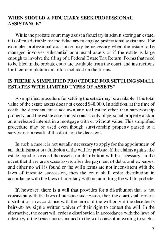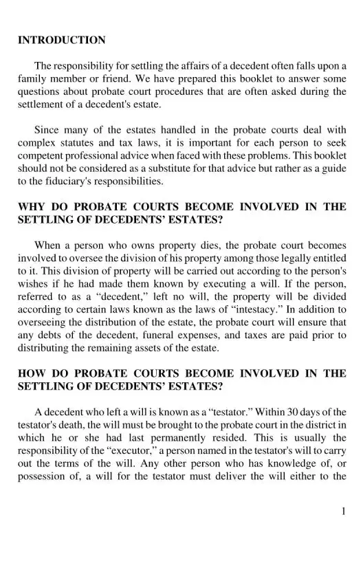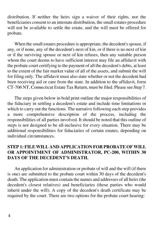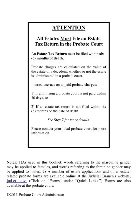The Connecticut Probate form serves as a critical tool in the administration of decedents' estates, guiding fiduciaries through the complex processes involved in settling an estate. This form outlines essential steps that must be taken following a person's death, including the requirement to file an estate tax return within six months. It emphasizes the importance of timely payment of probate charges, which are calculated based on the estate's value, and details the consequences of delayed filings. The probate court plays a pivotal role in overseeing the distribution of assets, ensuring that debts, funeral expenses, and taxes are settled before beneficiaries receive their inheritances. For those managing estates, the form highlights the responsibilities of fiduciaries, who must act with care and impartiality while navigating the legal landscape. Additionally, it notes that professional assistance may be advisable, particularly for larger or more complex estates. For smaller estates, a simplified procedure may be available, streamlining the process for those with limited assets. Overall, the Connecticut Probate form is designed to facilitate the efficient and fair administration of estates, reflecting the legal obligations and rights of all parties involved.