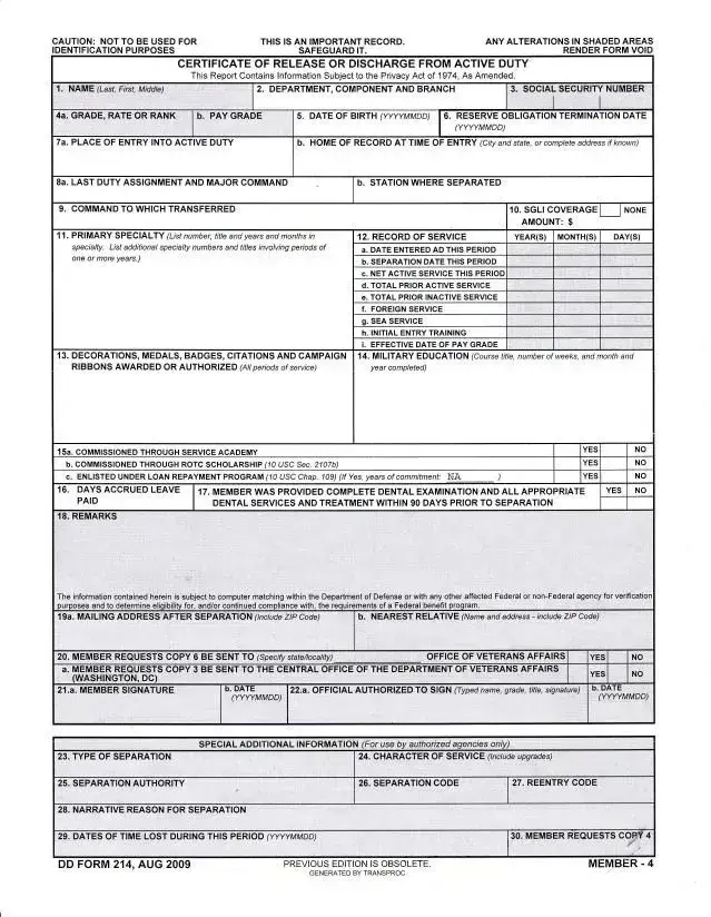 The DD Form 214, officially known as the Certificate of Release or Discharge from Active Duty, serves as a crucial document for military personnel transitioning to civilian life. It encapsulates a variety of essential information that validates a service member's time in the military. This form includes details such as the individual's name, social security number, and rank, as well as the dates of service and the character of discharge. Notably, it records any decorations, medals, or citations awarded during service, which can be vital for benefits and recognition. The DD 214 also outlines the member's military education and training, providing a comprehensive overview of their qualifications. Importantly, it is not merely a formality; it is a protected document under the Privacy Act of 1974, requiring careful handling to maintain its integrity. Given its significance, the DD Form 214 plays a pivotal role in accessing veterans' benefits, employment opportunities, and various other essential services. Understanding its components and implications can greatly assist veterans in navigating their post-service journey.