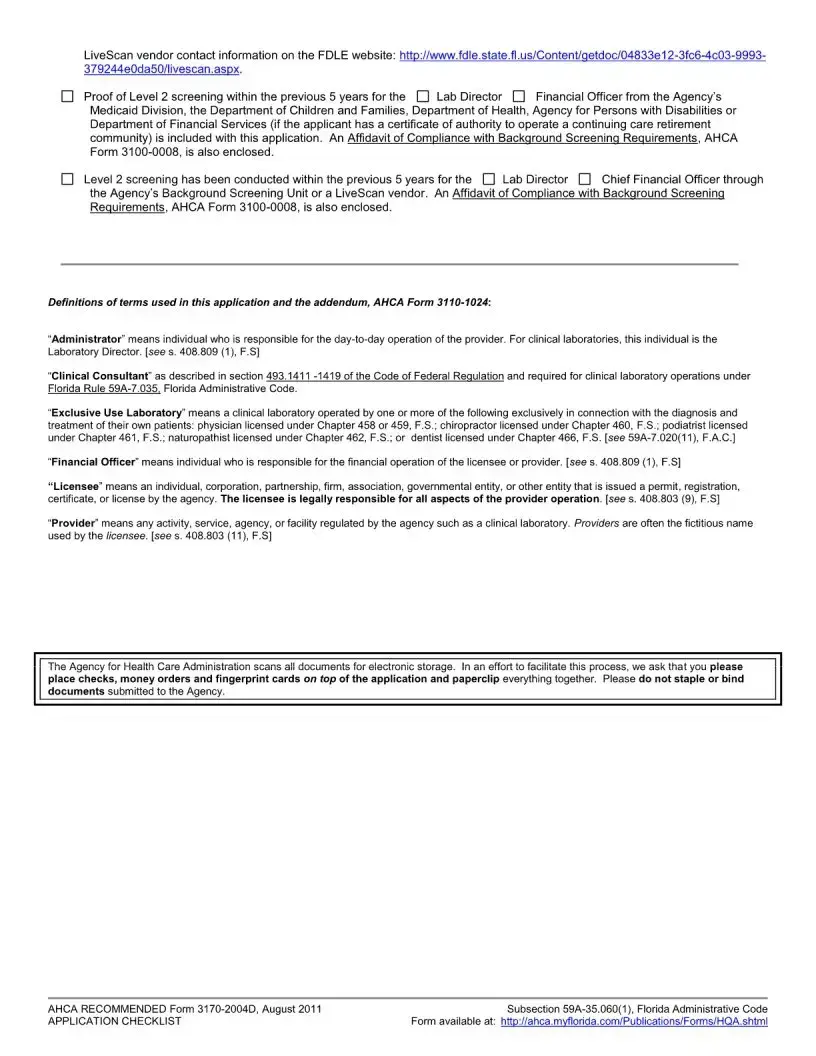 In addition, many applicants do not include the Affidavit of Compliance with Background Screening Requirements. This affidavit is essential and must accompany the application to confirm that the required screenings have been conducted.