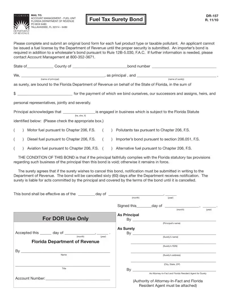 Filling out the Florida DR-157 form can be straightforward, but many individuals make common mistakes that can delay the process. One frequent error is failing to provide an original bond form for each fuel product type or taxable pollutant. The Department of Revenue requires a separate bond for each category, and submitting only one can lead to rejection.