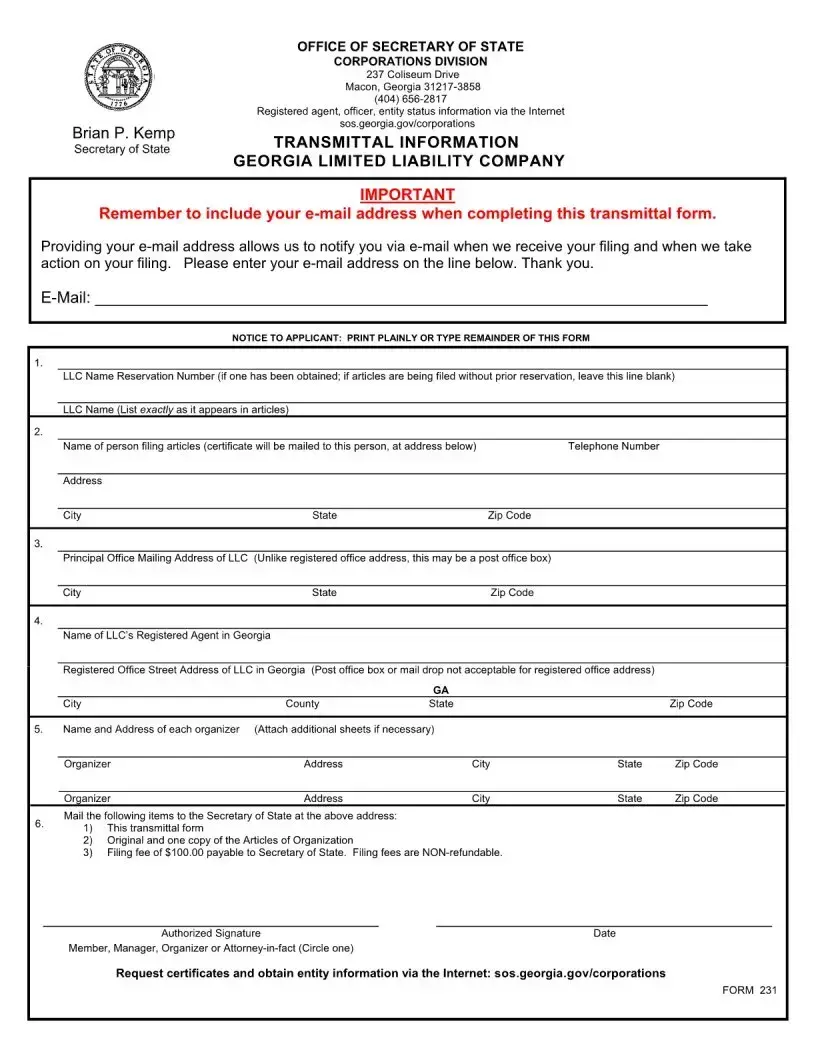 The Georgia 231 form is a crucial document for anyone looking to establish a Limited Liability Company (LLC) in the state of Georgia. This form facilitates the filing process by gathering essential information about the LLC, such as its name, registered agent, and principal office address. When completing the form, it is important to provide a valid email address, as this allows the Secretary of State's office to communicate updates regarding the filing status. The form requires details like the LLC name reservation number, if applicable, and the contact information of the person filing the articles. Additionally, it specifies the registered office address, which must be a physical location in Georgia and cannot be a P.O. box. Organizers must also be listed, ensuring that all parties involved are properly identified. To complete the filing, the form must be submitted along with the Articles of Organization and a non-refundable filing fee of $100. This straightforward process, while requiring attention to detail, ultimately paves the way for the formation of a legally recognized business entity in Georgia.