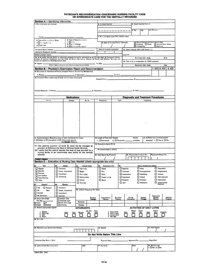 The Georgia DMA 6 form is an essential document for families seeking Medicaid coverage for pediatric nursing care. It serves as a physician's recommendation for children who may require institutional care due to medical needs. The form includes sections that collect identifying information about the applicant, such as their name, address, Medicaid number, and social security number. It also captures details about the primary care physician and the applicant's caregivers. A significant part of the form focuses on the physician's assessment, including medical history, diagnoses, medications, and treatment plans. There are specific questions regarding the applicant's current health status and the level of care recommended, whether it be in a nursing facility or another type of medical institution. Additionally, the form allows for the evaluation of nursing care needs, covering aspects like nutrition, mobility, and behavioral status. By providing this comprehensive information, the DMA 6 form helps determine eligibility for Medicaid services, ensuring that children receive the appropriate care they need.