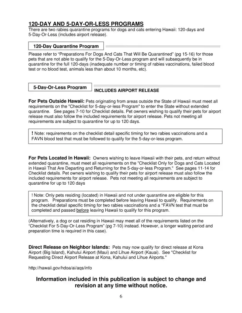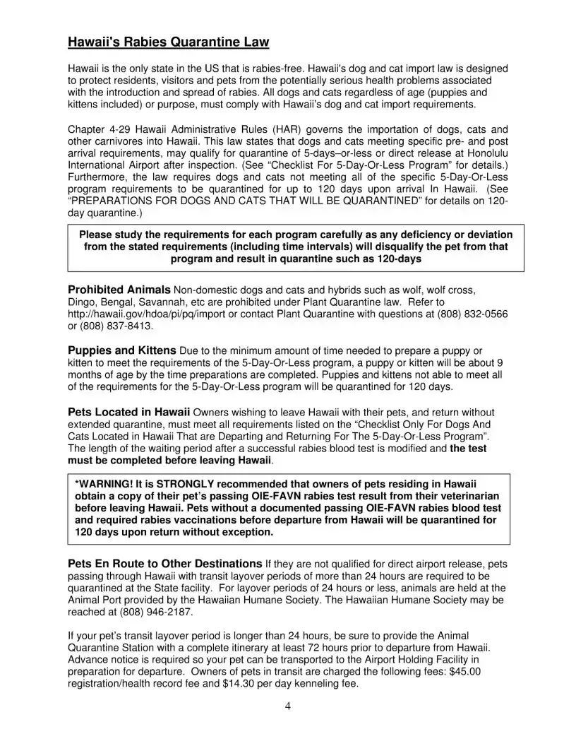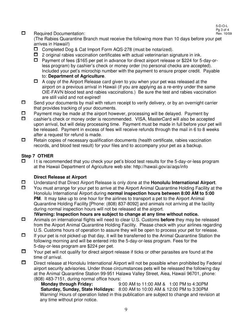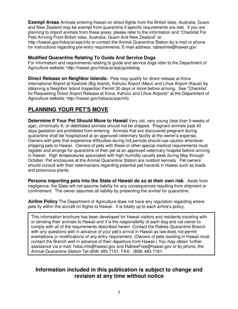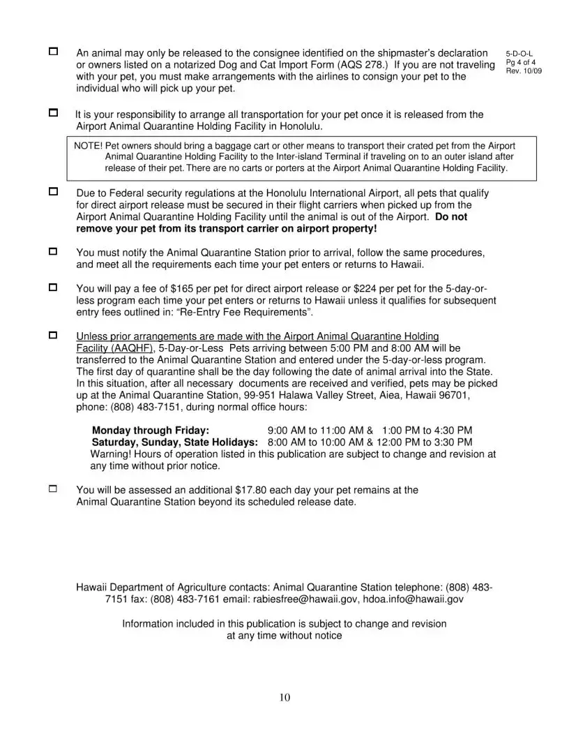 Traveling to Hawaii with pets requires careful planning, especially due to the state's strict rabies quarantine laws. The Hawaii Quarantine form is an essential document for pet owners, outlining the requirements for bringing dogs and cats into the state. This form includes details about the Animal Quarantine Station's location, contact information, and hours of operation. It also explains the two main quarantine programs: the 5-Day-or-Less program and the 120-Day quarantine, each with specific requirements that must be met. Understanding what animals are prohibited, such as certain hybrids, is crucial for compliance. Additionally, the form provides checklists for both pets arriving from outside Hawaii and those already residing in the state. Owners will find guidance on preparing their pets for travel, including necessary vaccinations and health checks. There are also important details about fees, pet care during quarantine, and how to visit or groom pets at the station. Reading and retaining this information will help ensure a smooth transition for both pets and their owners.