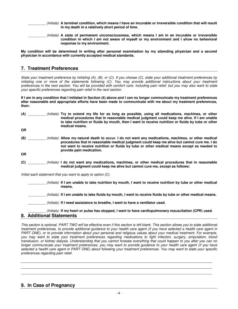 Another common error involves neglecting to complete all necessary sections. While it is possible to leave some parts blank, doing so may create ambiguity about one’s wishes. For example, if PART TWO—Treatment Preferences is not filled out, health care providers might not have clear guidance on what treatments the individual would want in a terminal condition. It is advisable to provide as much information as possible to avoid confusion during critical moments.