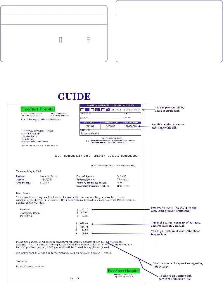 The Hospital Bill form is an essential document that provides a comprehensive overview of the services rendered during a patient's visit to the hospital. This form outlines crucial details such as the patient's name, account number, and date of service, ensuring that all relevant information is easily accessible. It includes a breakdown of charges, showing individual costs for services like emergency room visits and pharmacy expenses, as well as total charges, payments, and adjustments. Payment instructions are clearly stated, emphasizing the urgency of settling the amount due upon receipt. For those paying by credit card, the form offers a section to fill out card details securely. Additionally, it encourages patients to update their personal and insurance information, promoting accuracy in billing. The form also provides contact information for Patient Financial Services, allowing patients to seek assistance or request an itemized statement if needed. Overall, the Hospital Bill form serves as a vital tool for managing medical expenses and ensuring transparency in healthcare billing.