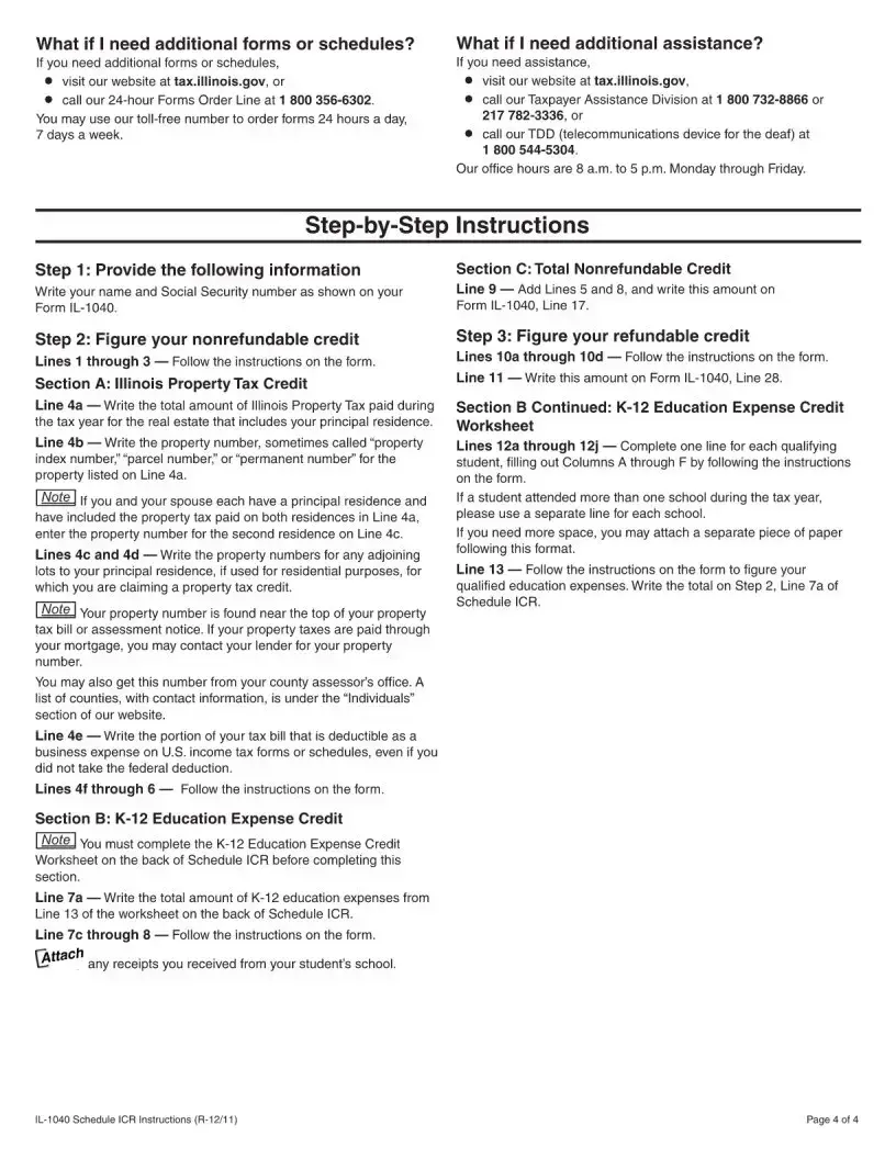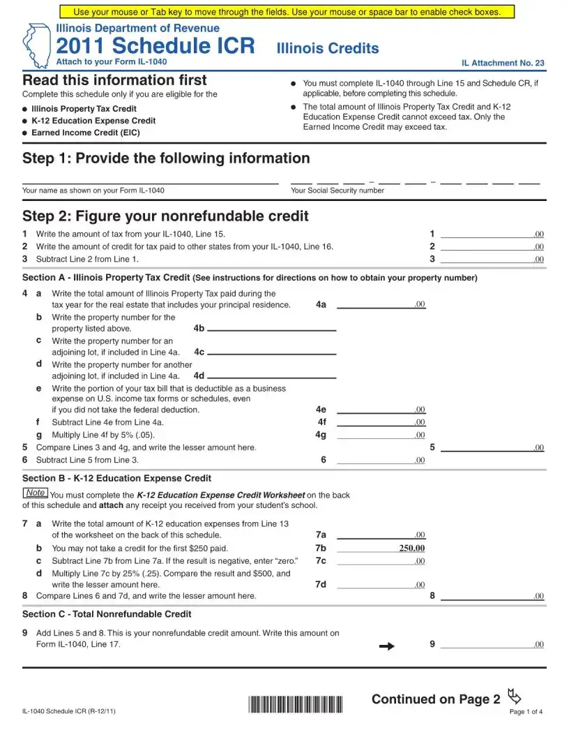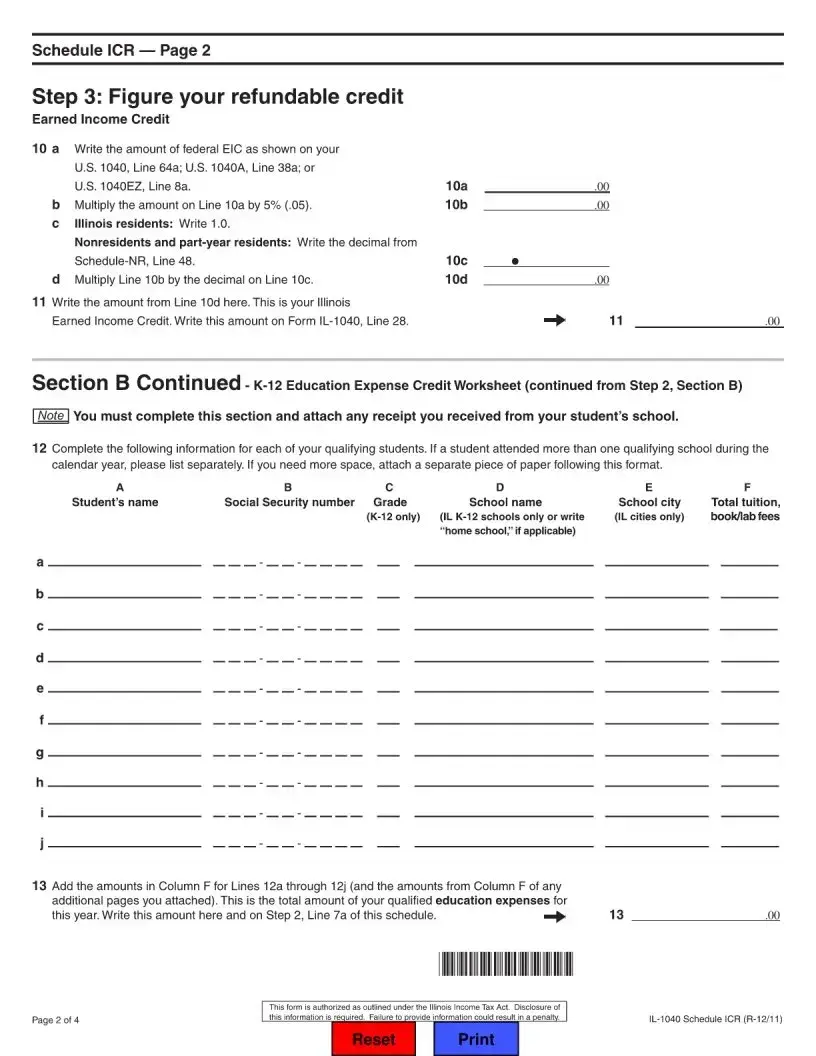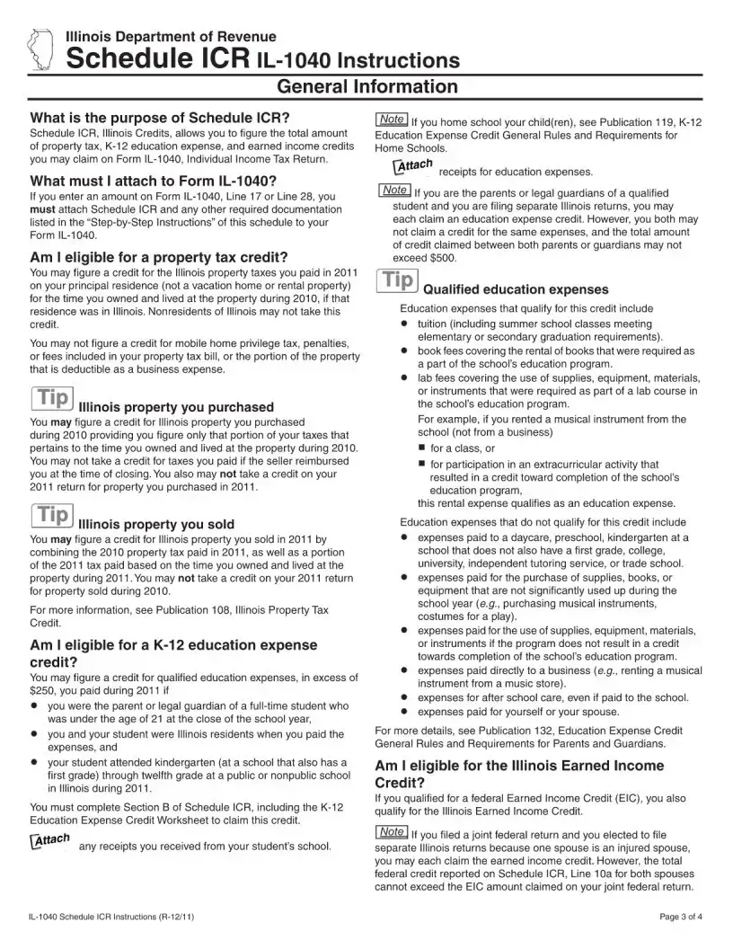 The Illinois Department of Revenue's Schedule ICR is a crucial document for taxpayers seeking to claim various credits on their state income tax return. This form allows individuals to apply for the Illinois Property Tax Credit, K-12 Education Expense Credit, and Earned Income Credit (EIC), provided they meet specific eligibility criteria. Before diving into the details of the ICR form, it is essential to complete the IL-1040 through Line 15 and Schedule CR, if necessary. The schedule requires taxpayers to provide personal information, such as their name and Social Security number, and to calculate their nonrefundable and refundable credits based on their tax situation. For instance, the Illinois Property Tax Credit is limited to the lesser of the calculated credit or the total tax owed, while the K-12 Education Expense Credit has its own set of guidelines and requires documentation of education expenses. Understanding these components is vital for accurate completion and maximization of potential tax benefits.