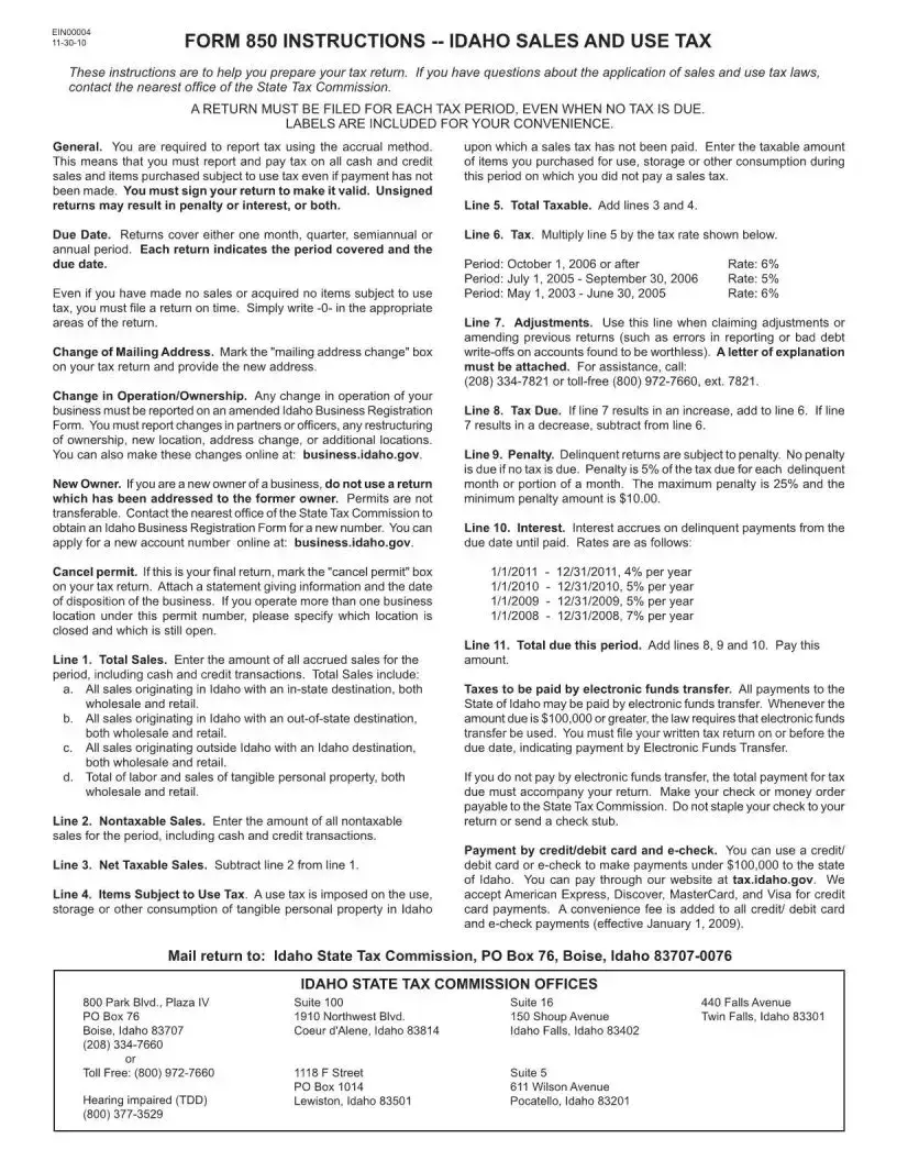 Completing the Idaho 850 form can be straightforward, but several common mistakes can lead to complications. One frequent error is failing to file a return even when no tax is due. It’s essential to remember that a return must be filed for each tax period, regardless of whether any sales were made. Simply indicating “-0-” in the relevant areas is sufficient to fulfill this requirement.