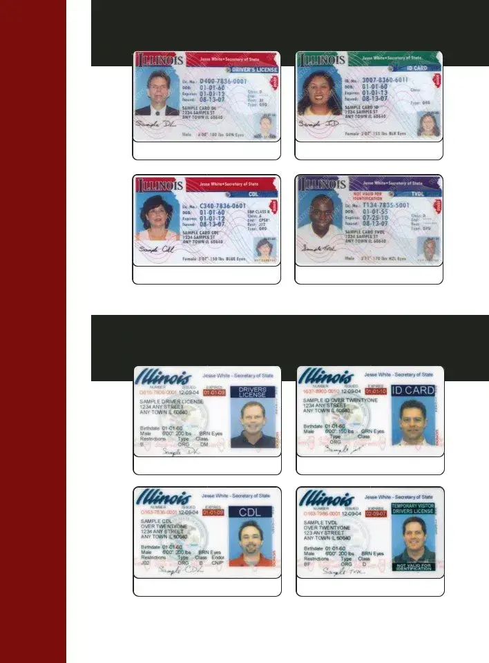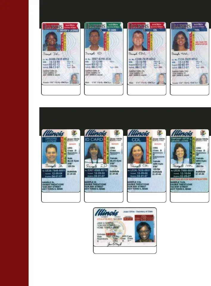The Illinois Driver’s License form encompasses a variety of essential components designed to meet the needs of different types of drivers and identification card holders. This form includes several categories, such as the standard Driver’s License, Commercial Driver’s License (CDL), and Temporary Visitor Driver’s License (TVDL), along with specific versions for individuals under 21 years of age. Each card type features distinct indicators, such as color bars that denote the category—red for Driver’s Licenses and CDLs, green for ID Cards, and purple for TVDLs. Security is a priority, evident in the incorporation of advanced features like a guilloche pattern, ghost images, and organ/tissue donor indicators. The form also highlights the importance of expiration and issuance dates, with updates phased in since Fall 2007. Additionally, there are significant changes regarding under 21 licenses and ID cards, which include vertical designs and specific security features to prevent misuse. The back of the license or ID card contains various barcodes for tracking and inventory purposes, as well as a web address for further information. Overall, the Illinois Driver’s License form is a comprehensive document that ensures secure and efficient identification for all eligible residents.