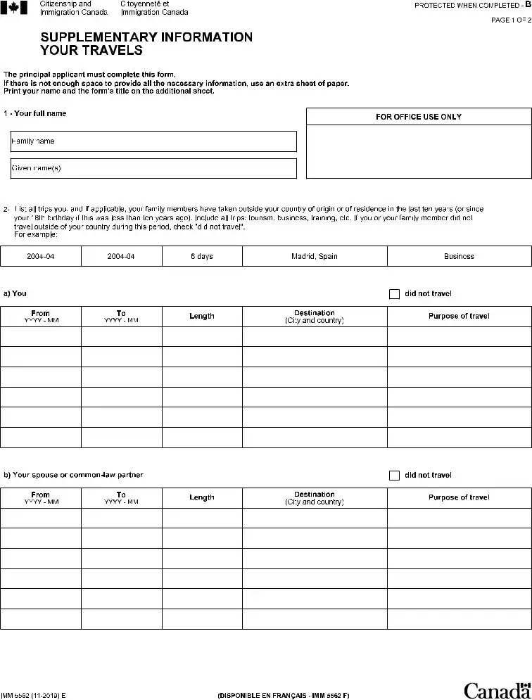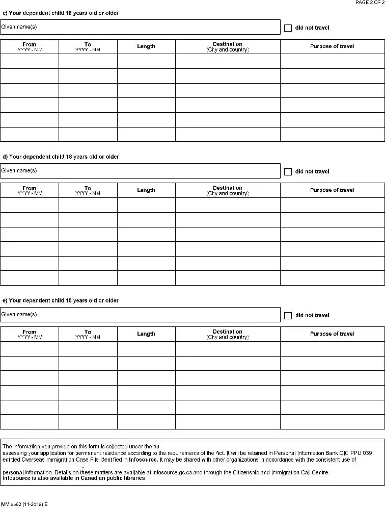 Filling out the Imm 5562 form can be a straightforward task, but mistakes are common. One significant error is failing to include all trips taken in the last ten years. Applicants often forget about short trips or business travel. It’s essential to list every journey, regardless of its purpose. If no travel occurred, simply checking the "did not travel" box is not enough. Make sure to double-check this section.