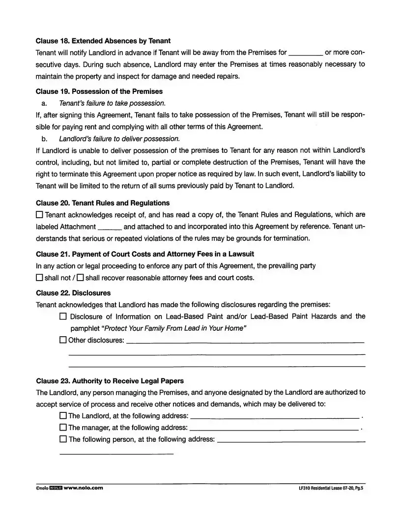 Clause 5 addresses the payment of rent, and many tenants overlook the section that explains how to deliver payment. Whether payments will be made by mail or electronically must be clearly stated. Miscommunication about this aspect can delay payments and lead to late fees.
