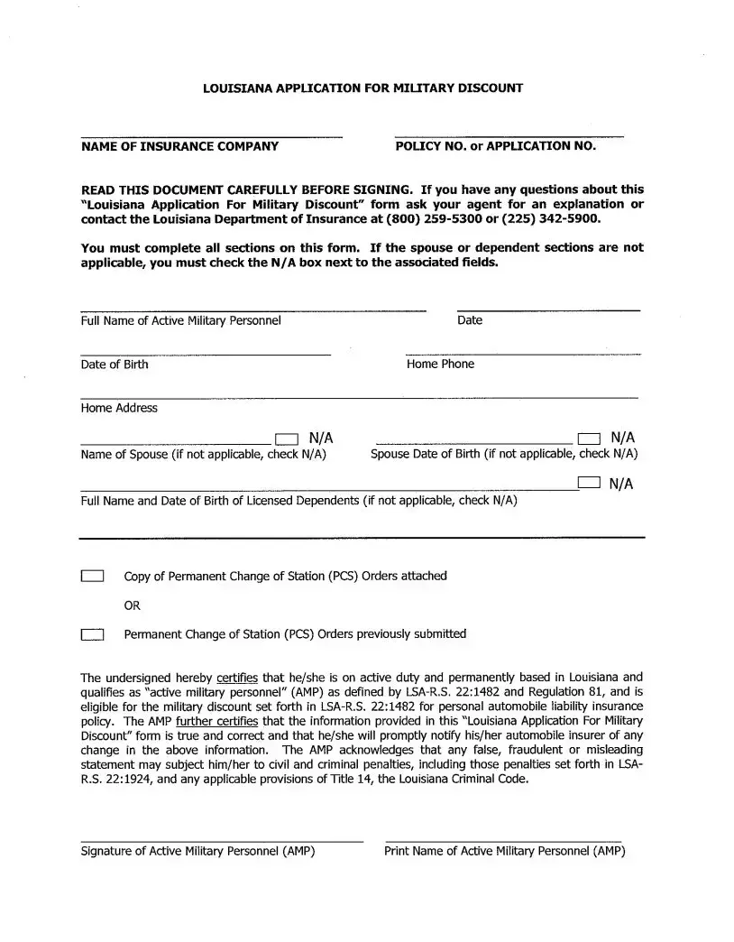 Filling out the Louisiana Military Discount form can seem straightforward, but many people make common mistakes that can delay their application or even result in denial. One frequent error is failing to complete all sections of the form. Each section is important, and if something does not apply, it is essential to check the N/A box. Ignoring this can lead to confusion and unnecessary follow-up.