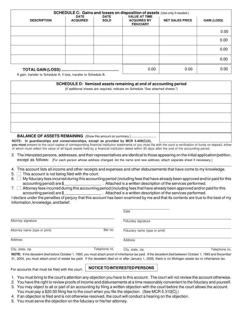 The Michigan PC 584 form, known as the Account of Fiduciary, Long Form, plays a crucial role in the management of estates and trusts. This form is primarily used by fiduciaries to provide a detailed account of financial activities related to the estate over a specified period, typically not exceeding 12 months. It includes essential sections such as a summary of assets, income, and disbursements, allowing for a clear overview of the estate’s financial status. The form requires fiduciaries to list all income received and expenses incurred, ensuring transparency and accountability. Additionally, it mandates the itemization of remaining assets at the end of the accounting period, which helps in tracking the estate's value. Notably, the form also includes provisions for reporting gains and losses from asset dispositions. To maintain the integrity of the accounting process, fiduciaries must attach supporting documents, such as financial institution statements, and provide detailed descriptions of services rendered by attorneys and fiduciaries. Understanding the requirements of the PC 584 form is essential for anyone involved in estate management in Michigan, as it facilitates effective communication with the probate court and interested parties.