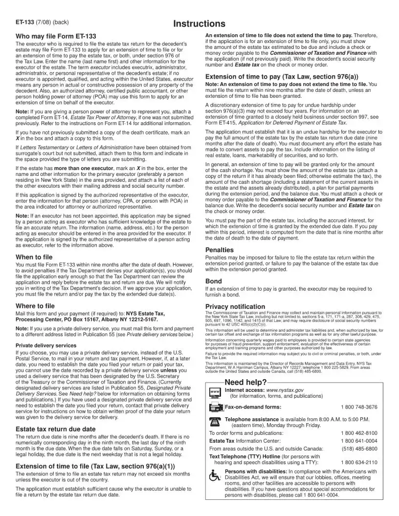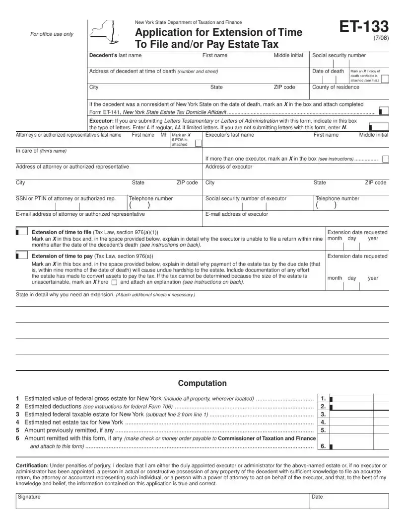 The New York ET-133 form serves as a crucial document for executors managing the estate of a deceased individual. This application allows for an extension of time to file or pay estate tax, addressing the potential complexities that can arise during the estate settlement process. Executors must provide essential information, including the decedent's name, social security number, and address at the time of death. Additionally, the form requires details about the executor, such as their name and contact information, as well as any authorized representatives involved. If the decedent was a nonresident, the executor must attach Form ET-141, the New York State Estate Tax Domicile Affidavit. The ET-133 also includes sections where the executor can explain their reasons for needing an extension, whether for filing or payment, and it emphasizes the importance of documentation to support these requests. The form must be submitted within nine months of the decedent's death to avoid penalties, and it is essential that executors follow the filing instructions carefully to ensure compliance with New York State tax laws.