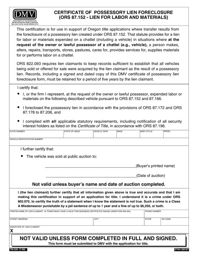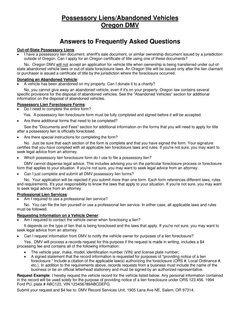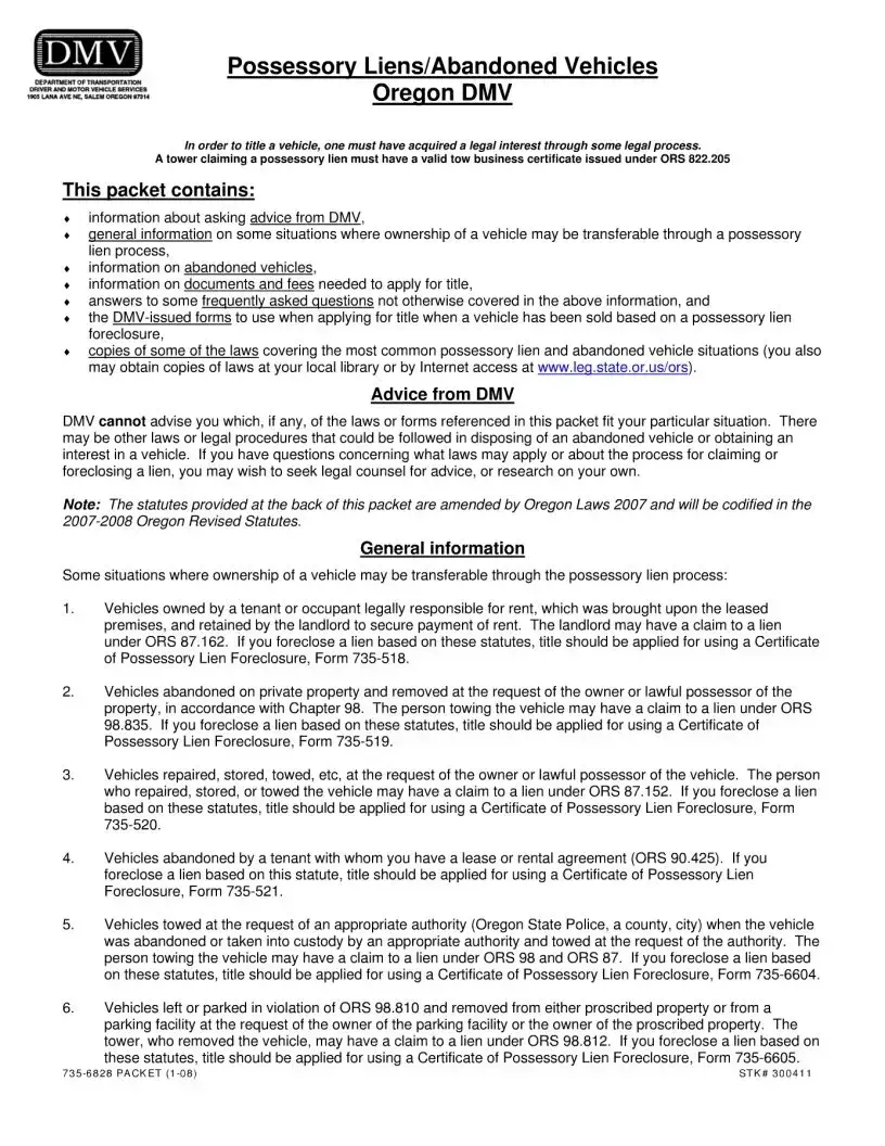 The Oregon Abandoned Vehicles form is a crucial document for anyone dealing with the complexities of vehicle ownership transfer, especially in cases involving abandoned vehicles or possessory liens. This form serves as a guide, outlining the legal processes required to claim ownership of a vehicle that has been abandoned or towed. It includes essential information about how to obtain advice from the Department of Motor Vehicles (DMV) and provides clarity on various situations where ownership can change hands through a possessory lien. The packet contains specific forms to apply for title after a vehicle has been sold due to a lien foreclosure, along with details on the necessary documents and fees involved in the process. Additionally, it addresses common questions and includes references to relevant laws that govern these situations. Understanding the nuances of this form is vital for landlords, towing companies, and vehicle owners alike, as it lays out the steps to legally reclaim or title a vehicle that may no longer be in the rightful owner's possession.