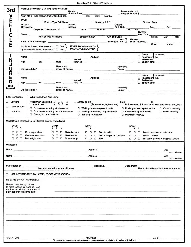 Lastly, individuals often forget to include information about all vehicles and parties involved in the accident. If there are additional vehicles, injured persons, or witnesses, it's important to use a second report form or a sheet of plain paper to document this information. Failing to do so can lead to incomplete records, which may affect liability determinations and insurance claims.