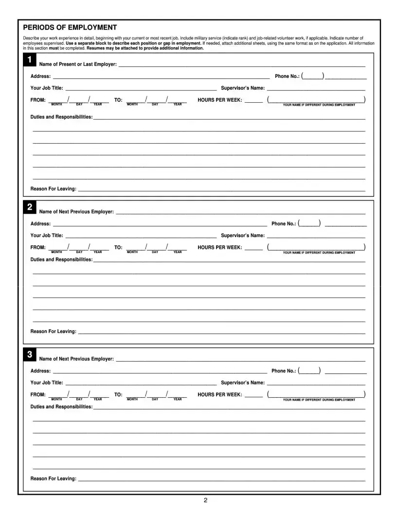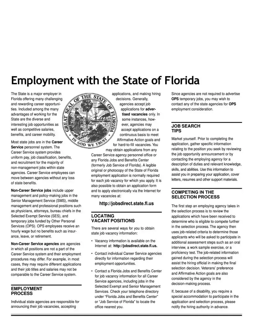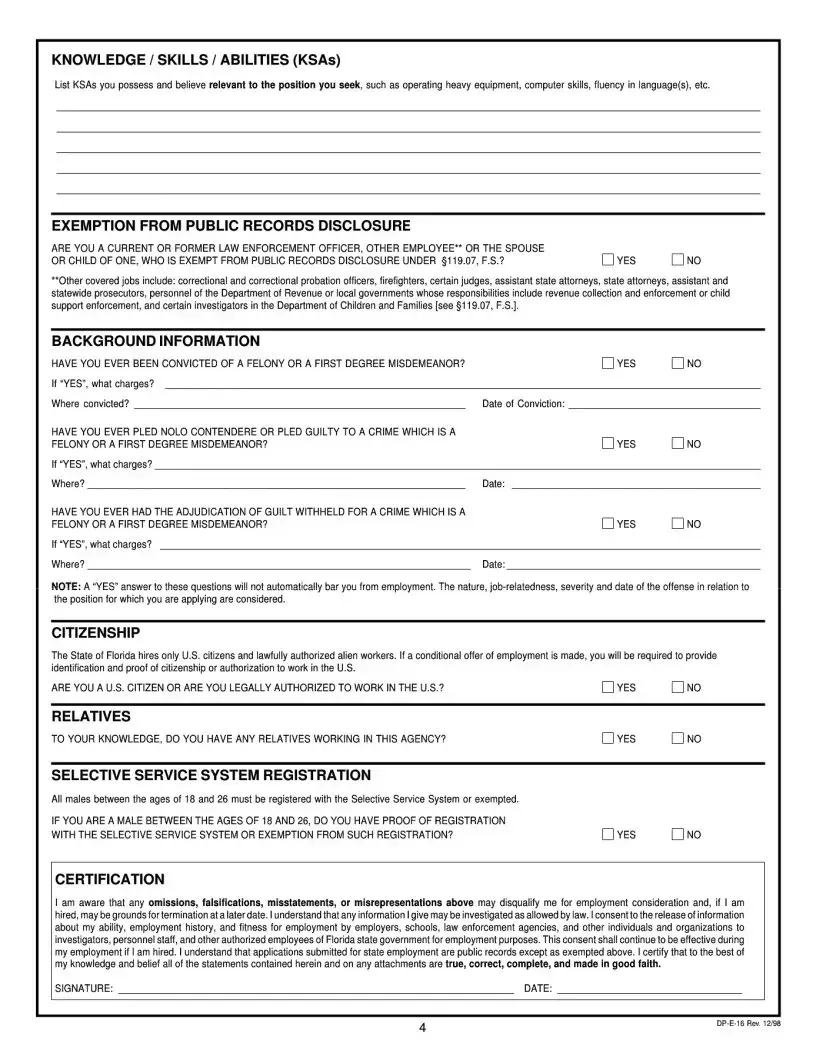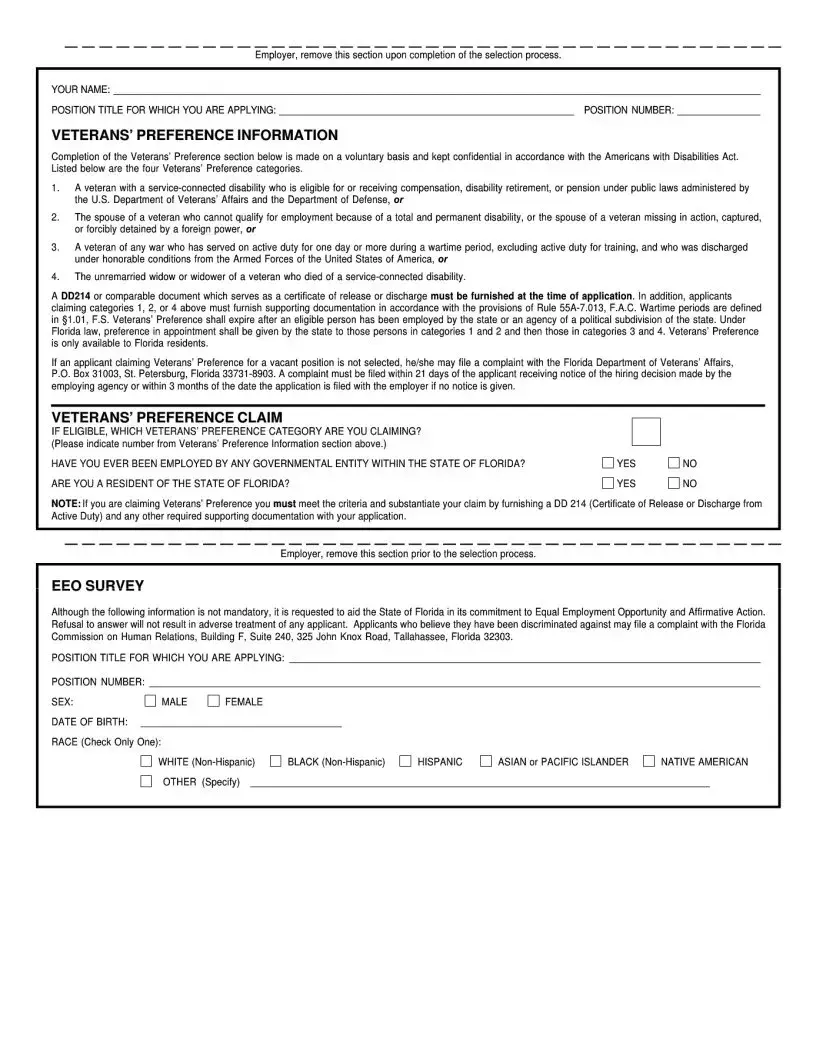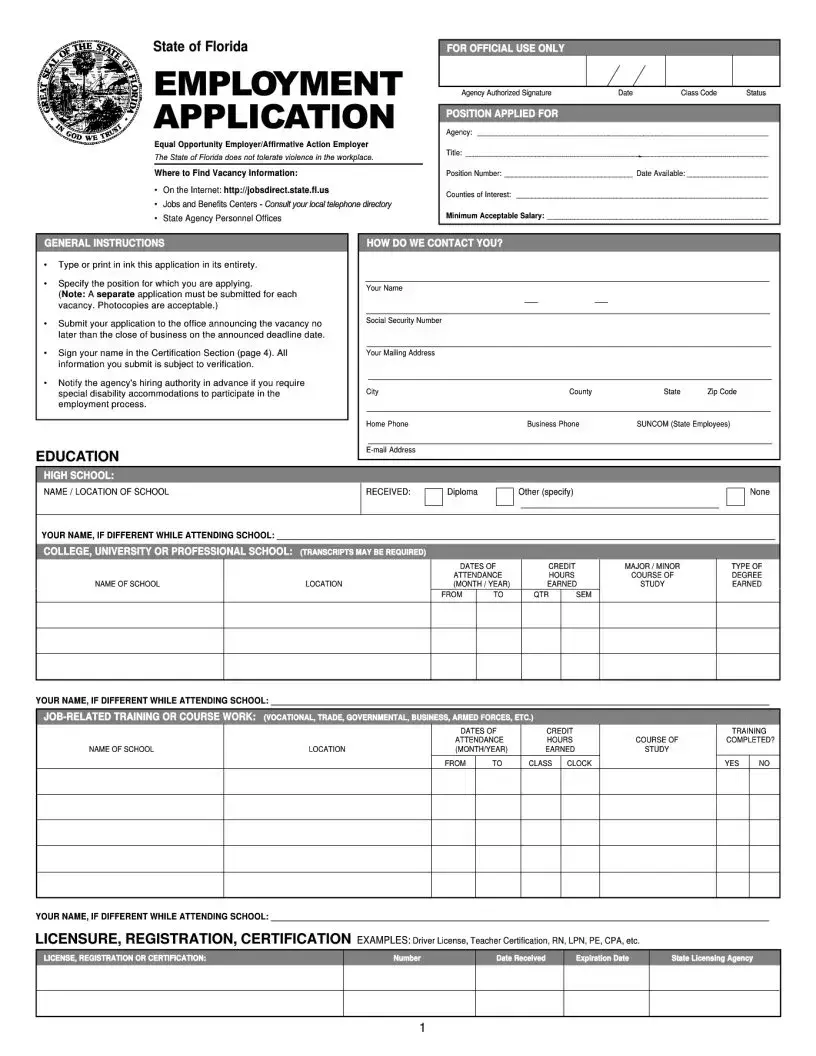 The State of Florida Employment Application form serves as a crucial tool for individuals seeking employment within various state agencies. This form is structured to gather comprehensive information about the applicant, including personal details, educational background, and work experience. Applicants must specify the position they are applying for, alongside their preferred counties and minimum acceptable salary. The application emphasizes the importance of accuracy and completeness, requiring individuals to type or print their responses clearly. Additionally, applicants are advised to submit their forms by the designated deadline to ensure consideration for the position. The form also includes sections for job-related training, licenses, and certifications, allowing candidates to showcase their qualifications. Notably, the application underscores the State of Florida's commitment to equal opportunity and affirmative action, as well as its zero-tolerance policy towards workplace violence. By following the outlined instructions, applicants can navigate the employment process more effectively, ensuring that their qualifications are presented in a clear and organized manner.
