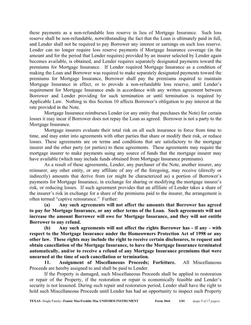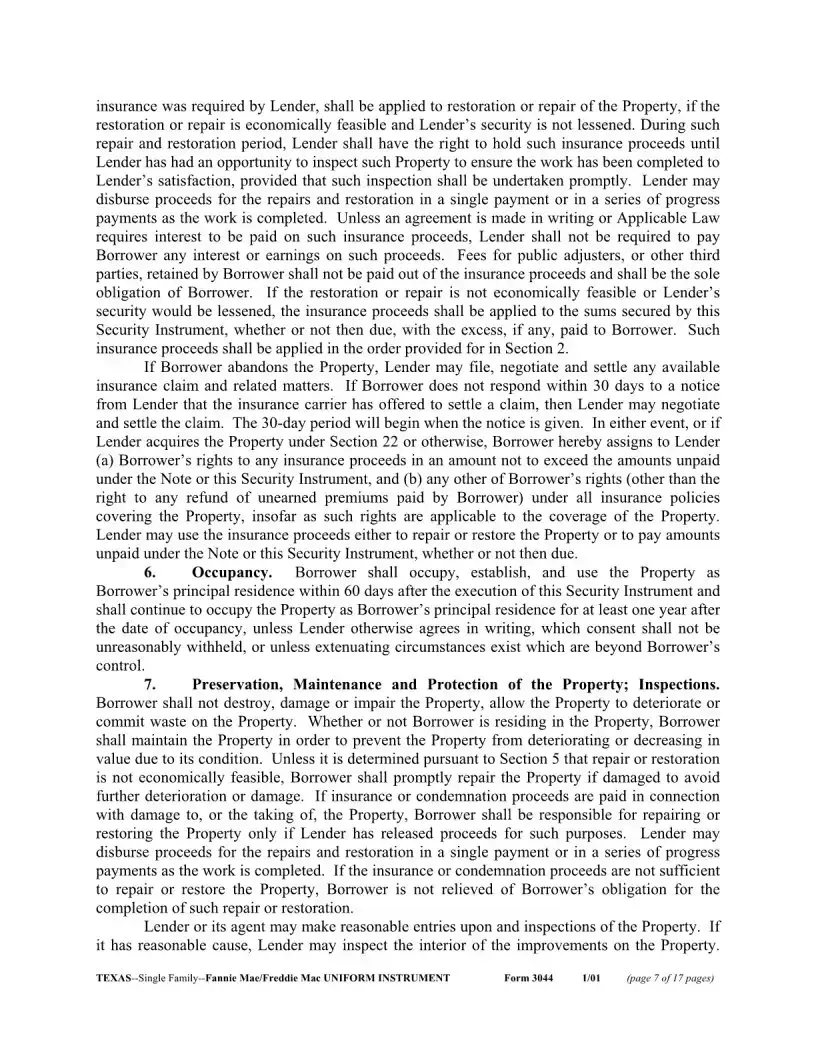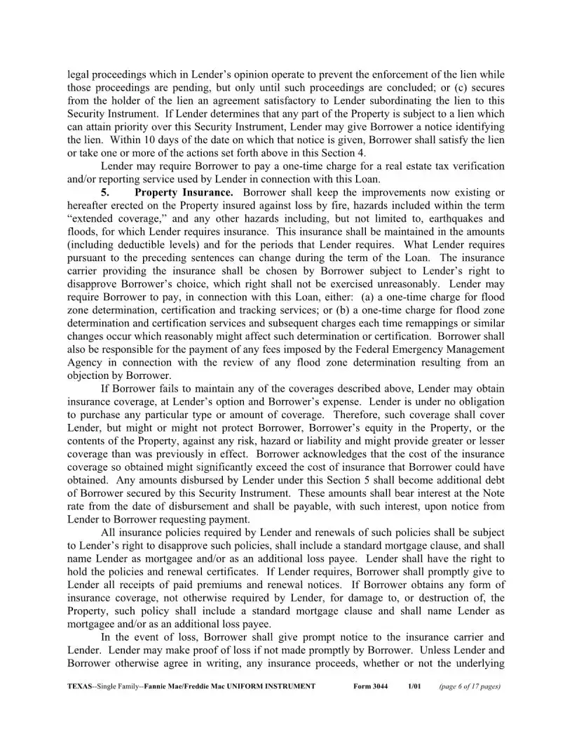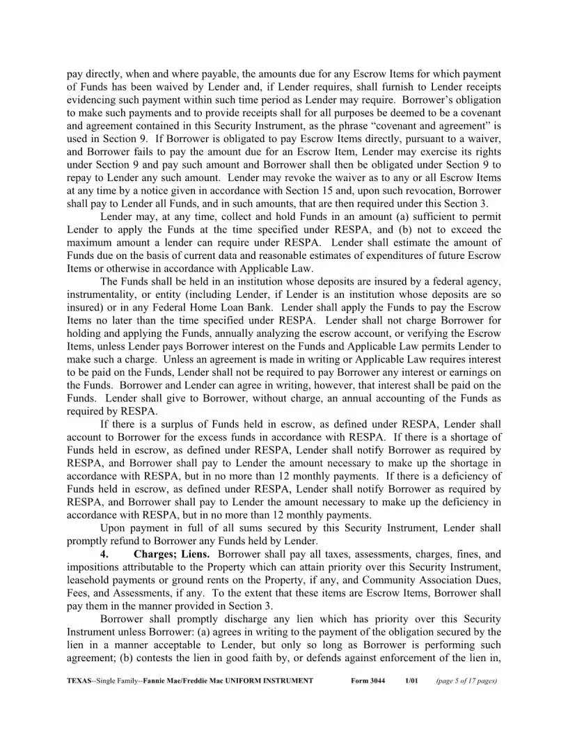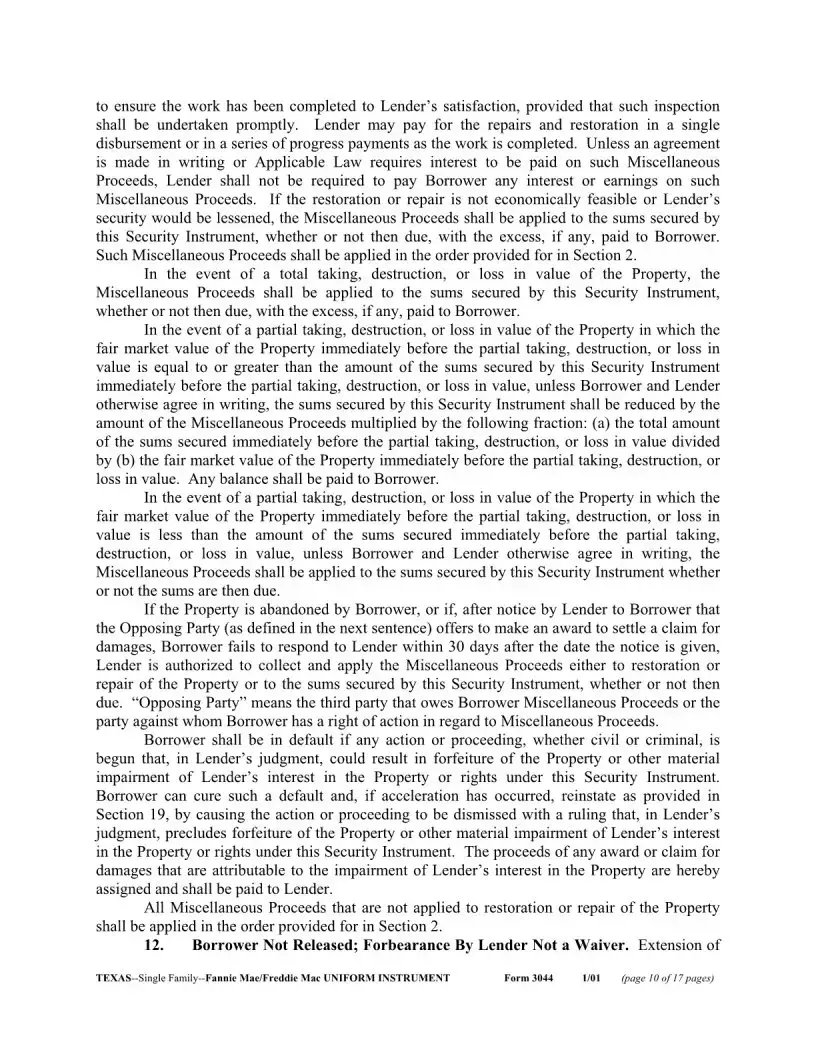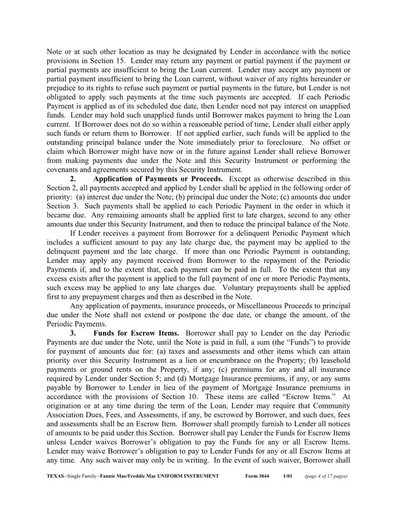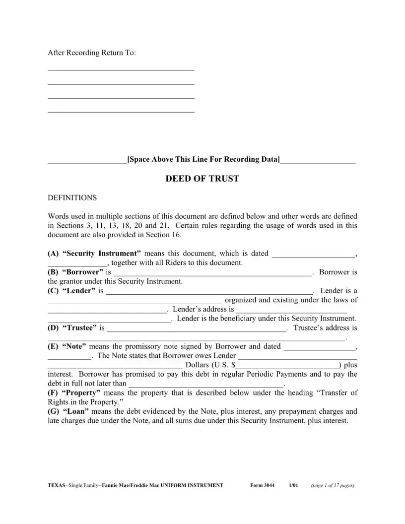 The Texas 3044 form is a vital document in the realm of real estate transactions, particularly for those involving loans secured by property. It serves as a Deed of Trust, which outlines the rights and responsibilities of the borrower, lender, and trustee. Within this form, several key terms are defined to ensure clarity and mutual understanding among all parties involved. For instance, the "Lender" is identified as the beneficiary under the security instrument, while the "Borrower" is the individual or entity that owes money to the lender. The document also specifies the "Property," which is the real estate being financed, and the "Loan," which encompasses not only the principal amount but also any interest and additional charges. Importantly, the Texas 3044 form includes provisions for various riders that may apply to the loan, such as adjustable rate or balloon riders, allowing for tailored agreements based on individual circumstances. Furthermore, it outlines the borrower's obligations, including the timely payment of principal, interest, and any associated fees. By incorporating these elements, the Texas 3044 form aims to protect the interests of all parties and facilitate a smooth transaction process.