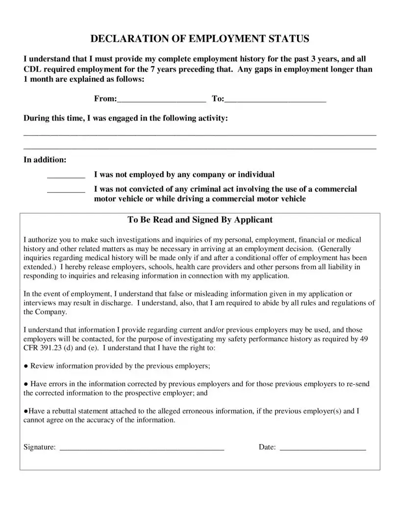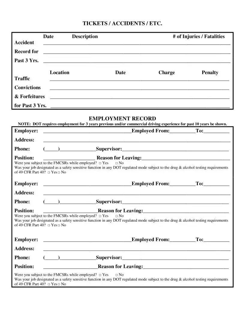 When seeking employment as a truck driver, the Truck Driver Job form serves as a critical tool for both applicants and employers. This form, provided by Monticello Bus Service, Inc., collects essential information that helps assess a candidate’s qualifications and readiness for the role. It begins by gathering personal details, including the applicant's name, current and previous addresses, and contact information. The form also requires the applicant's date of birth and Social Security number, ensuring that all necessary identification information is on hand. Additionally, it delves into the driver's license specifics, such as the state of issuance, license number, type, and expiration date. A significant section focuses on the applicant's driving experience, asking for details about past employment, including the duration of employment, job responsibilities, and whether the applicant was subject to federal regulations. This is crucial, as the Department of Transportation mandates a record of employment for the last three years and commercial driving experience for the past ten years. Furthermore, the form addresses any history of license denial or suspension, tickets, and accidents, which provides insight into the applicant's driving history. By completing this form accurately, candidates can present a comprehensive picture of their qualifications, paving the way for potential employment opportunities.