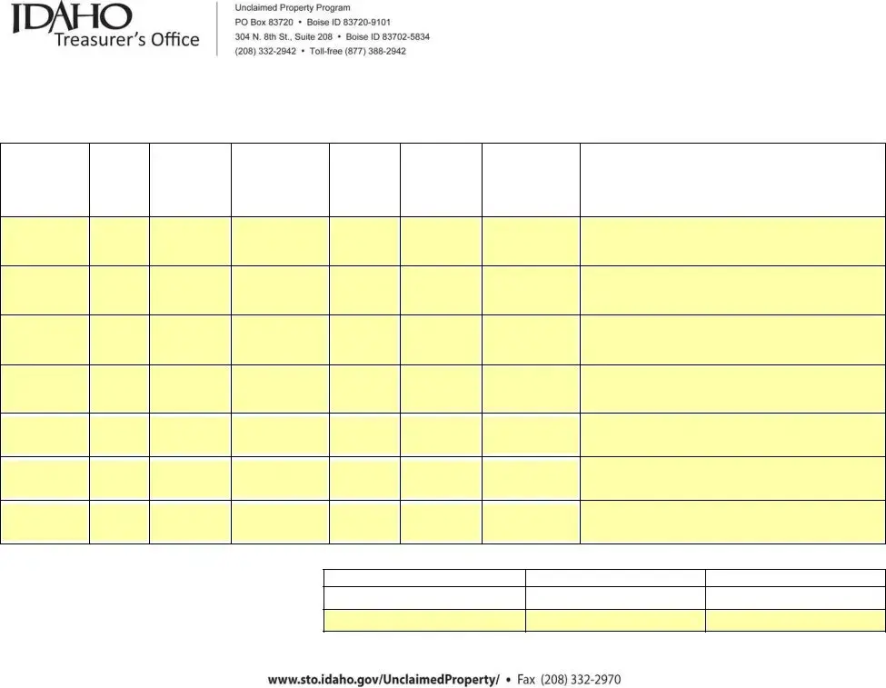 The Up2 Idaho form serves a critical function in the realm of unclaimed property reporting, providing businesses with a structured method to disclose various types of unclaimed assets. This form is essential for organizations seeking to comply with state regulations regarding unclaimed property, ensuring that they accurately report and remit funds that rightfully belong to individuals. Key components of the form include details such as the business name, Employer Identification Number (EIN), and account or check numbers, which help identify the reporting entity and the specific transactions in question. Additionally, it requires information about the property code, date of the last transaction, and the amount being remitted, allowing for clear tracking of unclaimed funds. The form also captures owner-specific details, including the owner’s Social Security Number, name, and address, which are vital for reconnecting unclaimed assets with their rightful owners. If there are multiple owners, the form accommodates this by allowing the filer to specify their relationship to the primary owner, ensuring comprehensive reporting. By requiring totals for properties, shares, and dollars remitted, the Up2 Idaho form facilitates transparency and accountability in the handling of unclaimed property, ultimately serving the interests of both businesses and individuals alike.